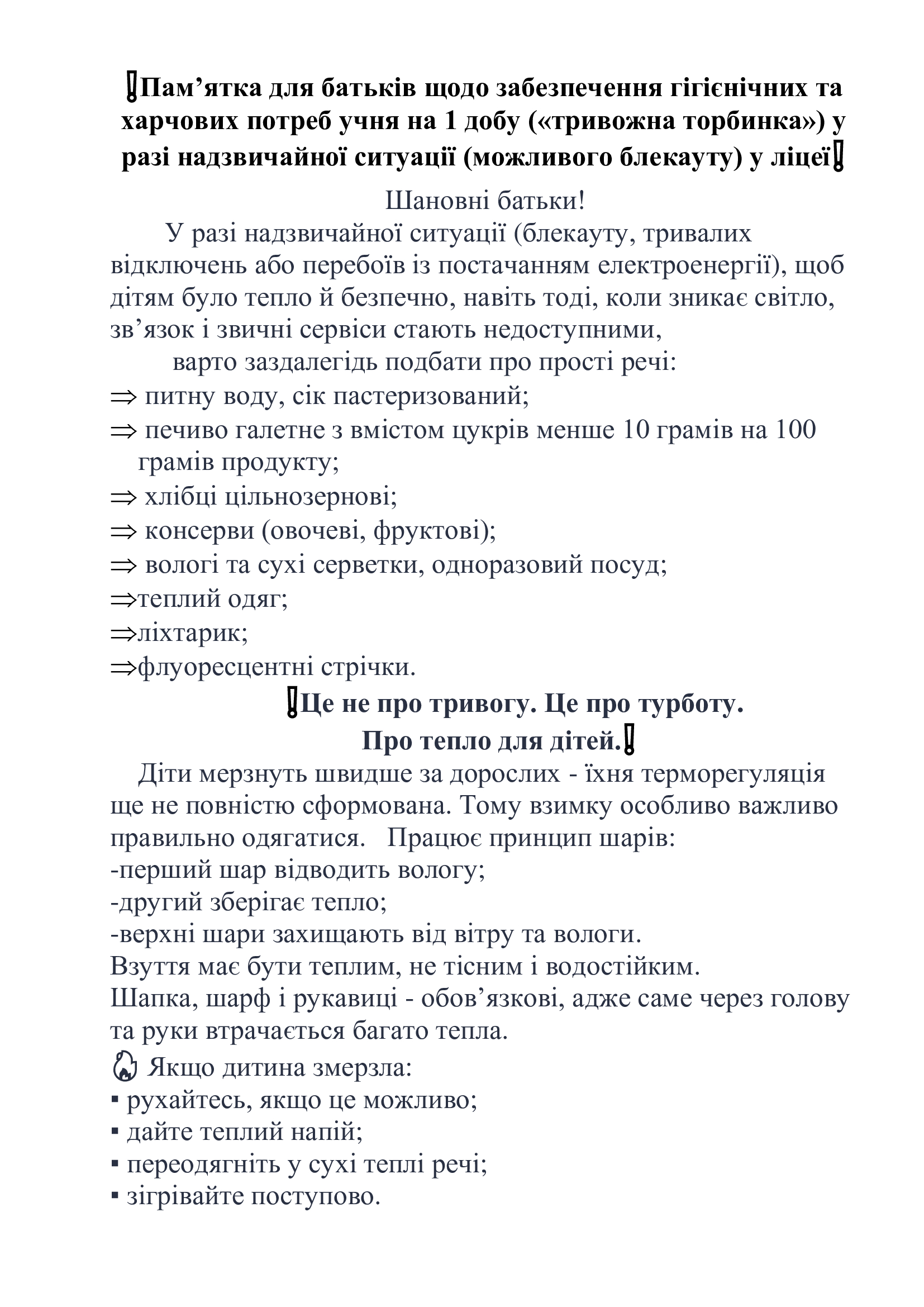 Пам'ятка для батьків щодо забезпечення гігієнічних та харчових потреб учня на 1 добу ("тривожна торбинка") у разі надзвичайної ситуації (можливого блекауту) у ліцеї